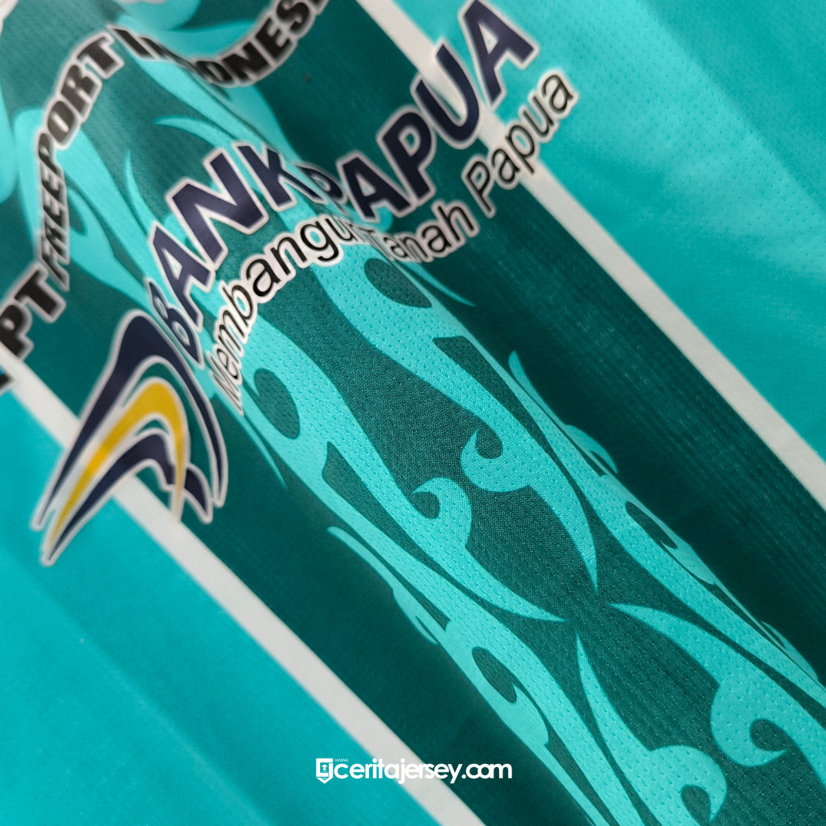 Warna biru langit mendominasi keseluruhan jersey. Pilihan ini bukan tanpa alasan. Bagi masyarakat pesisir Papua, laut bukan sekadar bentang geografis — ia adalah rumah, jalan hidup, dan ruang juang. Motif khas “Karirin” yang mengalir di bagian depan jersey menjadi penanda kuat akan warisan budaya lokal: ukiran perahu tradisional yang menyimpan filosofi Mabri — perompak pemberani dari Biak yang identik dengan keberanian dan kebebasan.